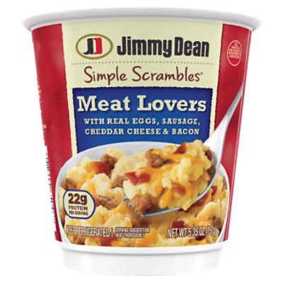 Jimmy Dean Meat Lovers Simple Scrambles, 4 pk./5.35 oz. Made in USA. Wake up and enjoy a freshly made breakfast with Jimmy Dean Meat Lovers Simple Scrambles. Made with two real eggs, premium pork sausage, bacon, and cheddar cheese, our Simple Scrambles are packed with 23 grams of protein per serving for a hearty breakfast that’s ready in seconds. Simply combine heat, and eat for a freshly ...