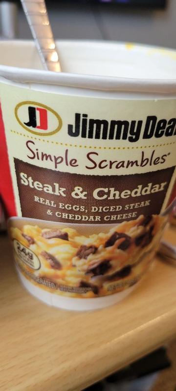 Just tried Jimmy Dean - Simple Scrambles : keto - reddit level 1. Knukey. M/46/5'10" SW:335 CW:236 GW:215. 3 years ago. I use a coffee cup, put in two eggs, pat of butter, sprinkle of cheese and some cooked bacon or sausage crumbles. Nuke it for like a minute and a half, stir and done. Heat more if needed.